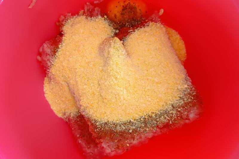 KROK 1: Mäso vložte do misy, pridajte vajcia, strúhanku, korenie, osoľte, pridajte pretlačený cesnak.