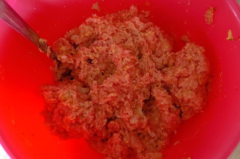 KROK 3: Cibuľu pridajte k mäsu a všetko dôkladne premiešajte. Vytvorte šišku. Povrch môžete uhladiť mokrými rukami.