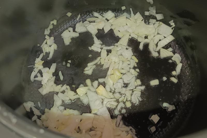 KROK 2: Stlačte ŠTART. Do nádoby nalejte olej. Na oleji orestujte cibuľu do zhnednutia. Pre ukončenie programu stlačte STOP.